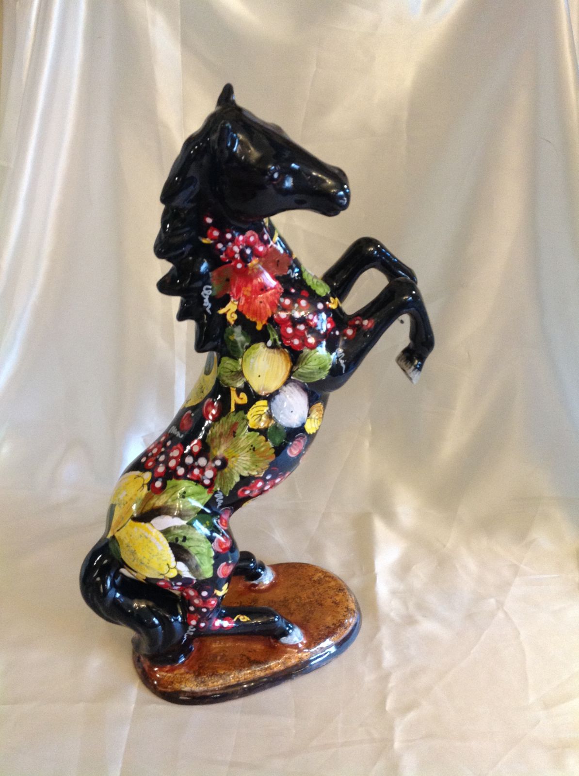 Cavallo rampante h 44 con frutta mista fondo nero fatto e dipinto a mano Made in Italy